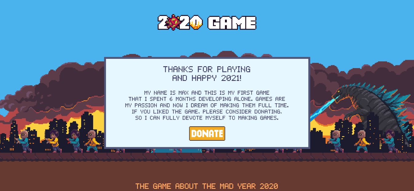 Sin duda el 2020 ha sido el peor año para todos los habitantes del planeta tierra. Aún así, nos encontramos en ascuas por saber qué ocurrirá este 2021. ¿Pero, qué pasaría si por una extraña razón volveríamos a revivir los sucesos del año pasado?. Max Garkavyy, desarrollador independiente de videojuegos, nos presenta su opera prima, un título sencillo de plataforma, que podemos disfrutarlo en nuestro navegador favorito.